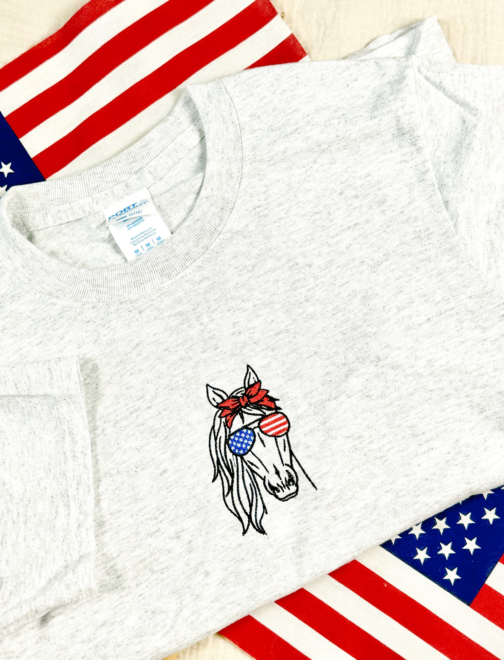 Giddy up, America-this tee is bringing stars-spangled sass to your summer lineup. Featuring our embroidered horse head rocking flag sunglasses and a red bandana, it's the kind of look that says, "I love liberty, horses, and looking good." Available in adult and kids sizes, because matching outfits are the real American dream. These tees are soft, comfy, and cheekier than a firecracker in a hay bale.