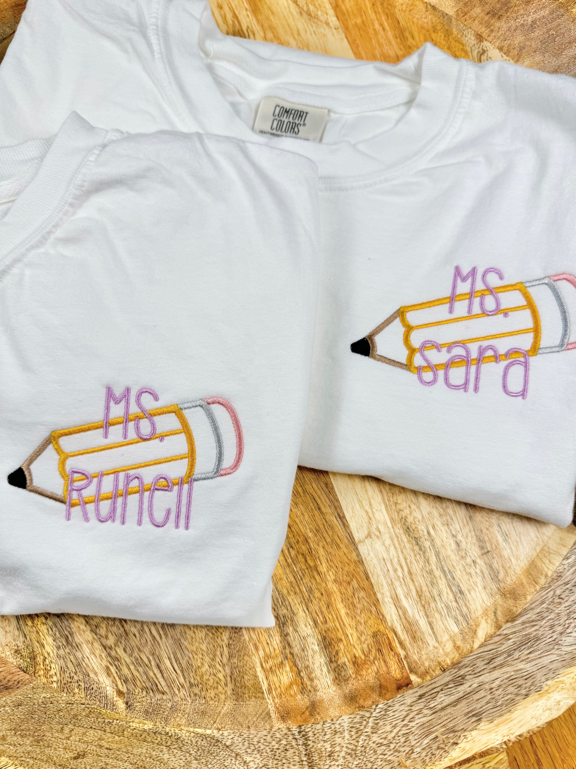 Sharp mind, cute tee. Our Pencil Teacher Tee is the A+ addition to your school year wardrobe, featuring an adorable pencil and custom name on the left chest-because you deserve to wear your title with style.