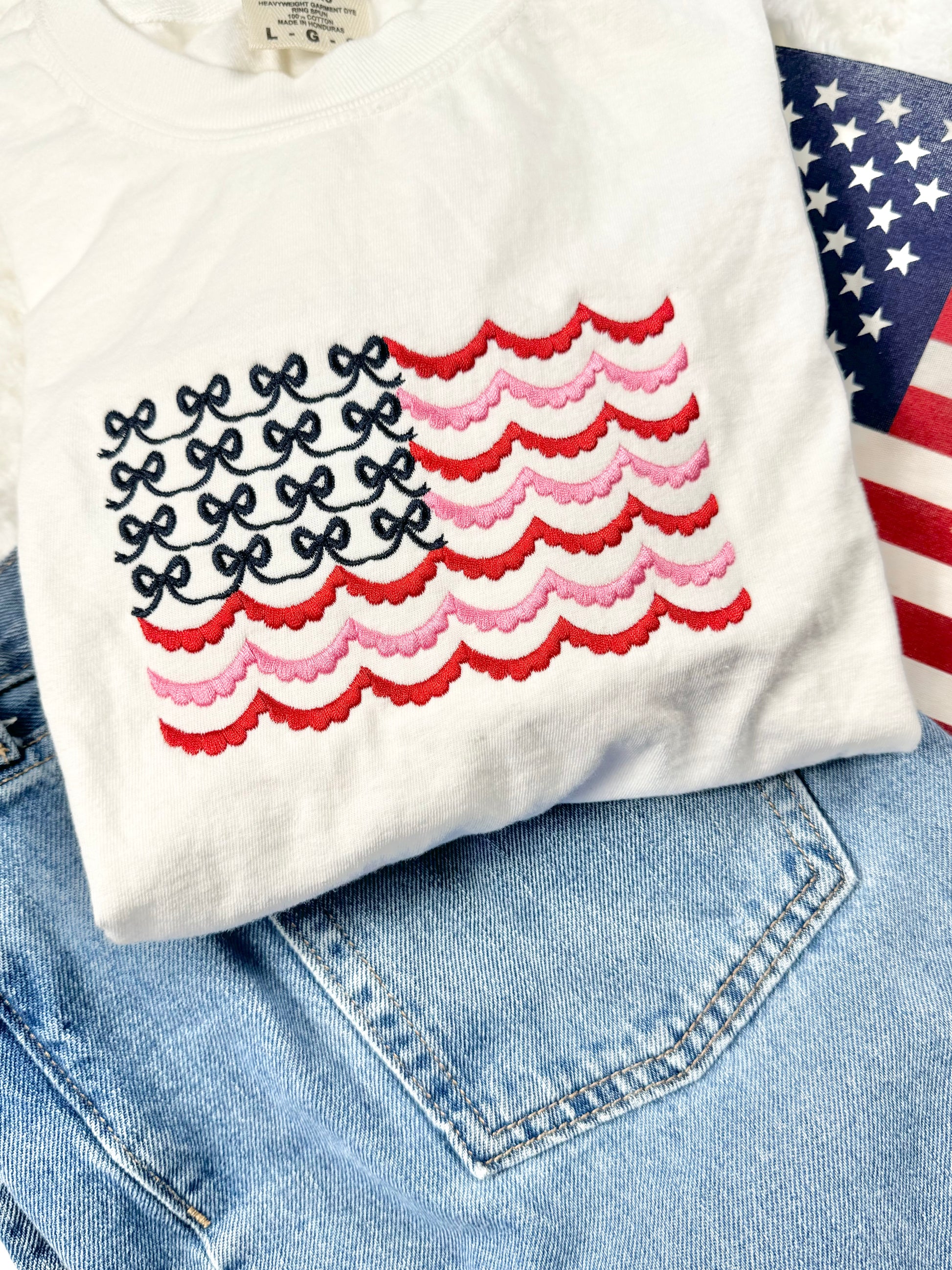 Stars, stripes, and the cutest bows you've ever seen. The Red, White, and Bows tee is the perfect mix of patriotic and pretty- featuring a scalloped American flag with sweet little bows instead of stars for an extra dose of charm. This Comfort Colors shirt is your go to for BBQs, beach days, parades, and everything in between. Who says patriotic can't be adorable?
